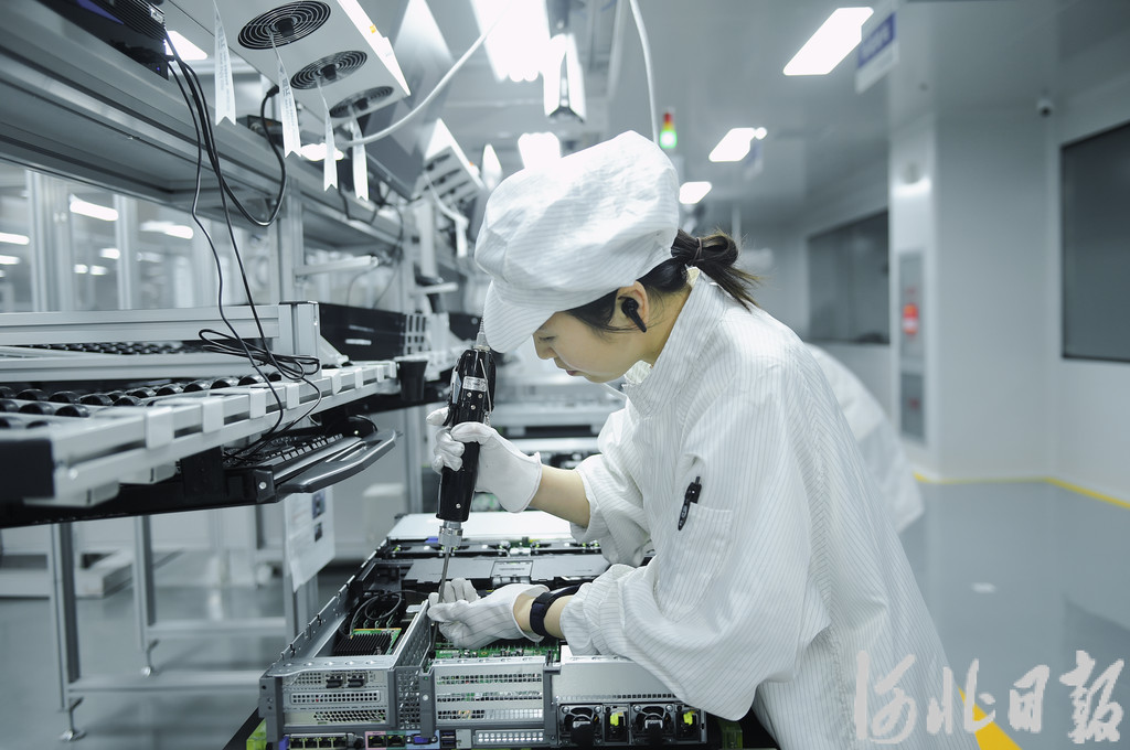 6月20日,距離雄安站不遠(yuǎn)的科創(chuàng)中心中試基地內(nèi),雄安百信信息科技有限公司的生產(chǎn)車間一派繁忙:AGV(自動導(dǎo)引運輸車)智能搬運機器人自動運送零部件,抓取機器人將零部件精準(zhǔn)地抓取到生產(chǎn)線上,碼垛機器人將生產(chǎn)好的服務(wù)器產(chǎn)品自動碼到包裝線上,進行封箱和打標(biāo)……