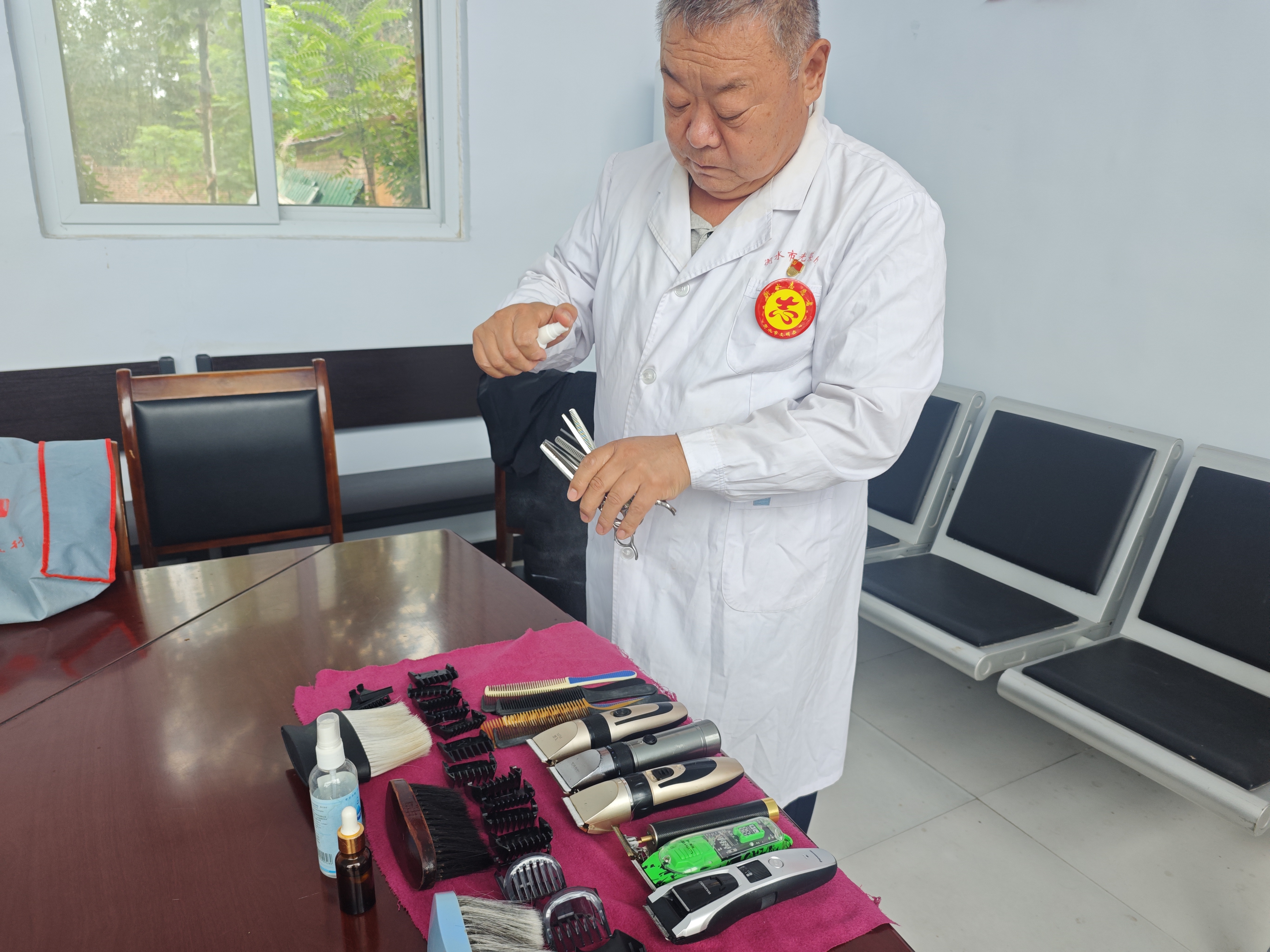 “來了!我這頭發就等著他剪呢。”77歲的張秀玲裹著薄外套,遠遠看見郝宏銀的車影就開始笑著招手。村黨群服務中心里,早已有多人在等候了。郝宏銀熟練地打開工具箱,拿出酒精噴霧,對著每一件工具仔細消毒。“消毒不能省,得讓老人們用得放心?!彼χ鴮^來的73歲老人高虎民說。