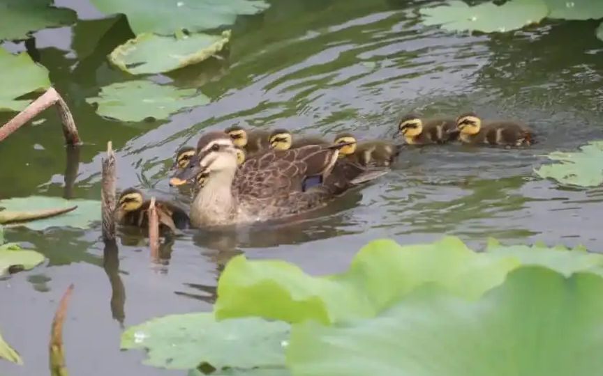 2025年6月1日,衡水湖中的斑嘴鴨親鳥帶雛鳥活動。 王鐵良 攝