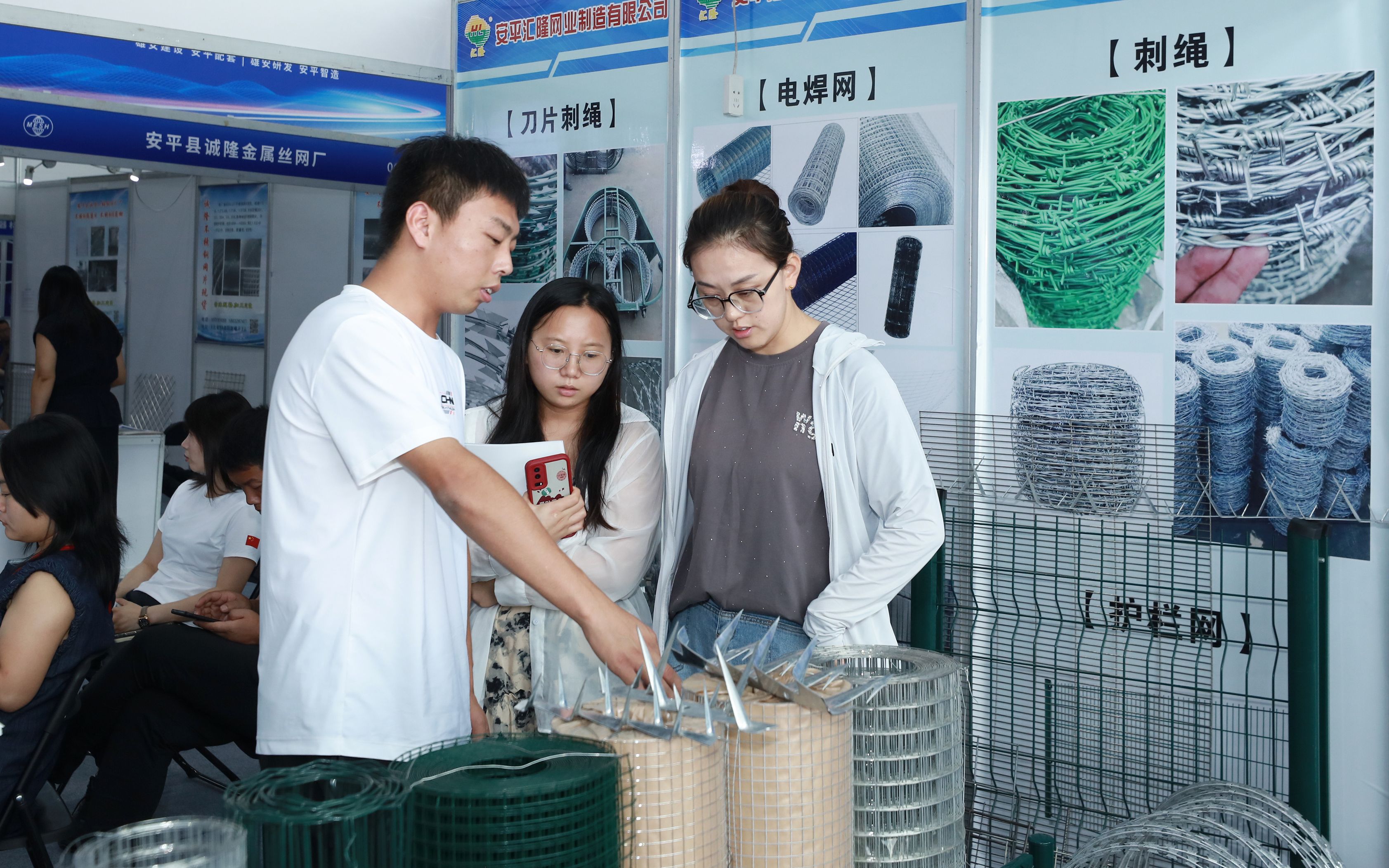 7月10日,2025雄安·衡水協(xié)作區(qū)安平絲網(wǎng)及農(nóng)產(chǎn)品產(chǎn)貿(mào)對(duì)接會(huì)開(kāi)幕式現(xiàn)場(chǎng),參展商正在為客商介紹絲網(wǎng)產(chǎn)品。陳月振 攝