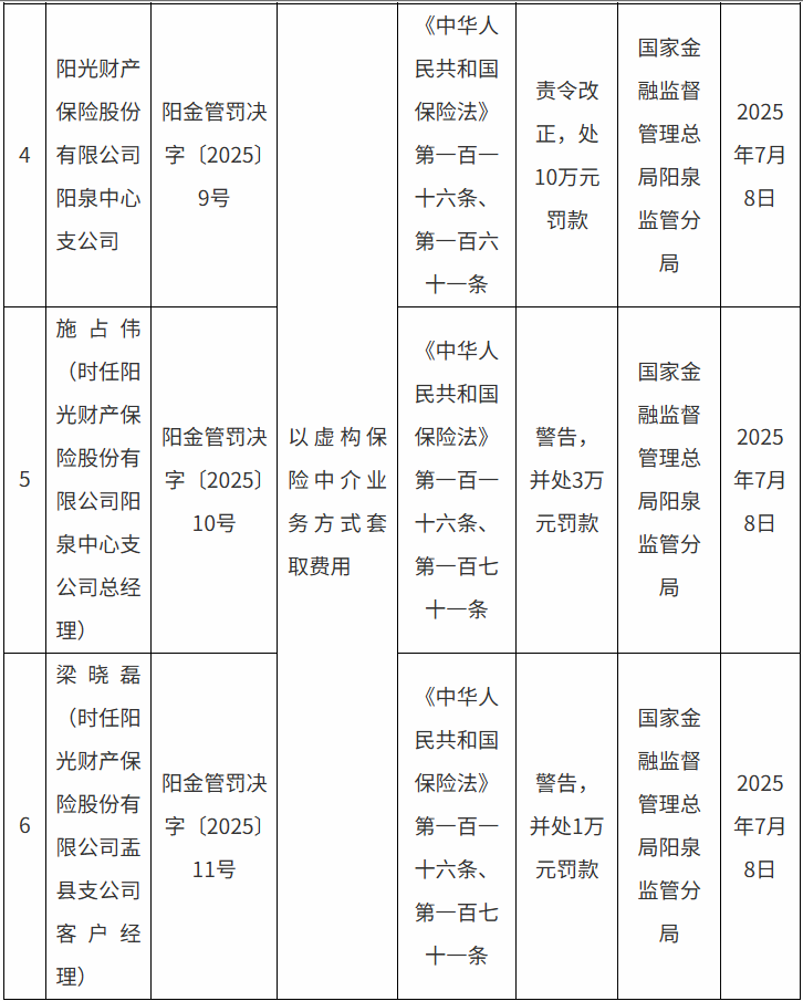 同時,時任陽光財險陽泉中心支公司總經理施占偉因以虛構保險中介業務方式套取費用,被警告,并處3萬元罰款;時任陽光財險盂縣支公司客戶經理梁曉磊因以虛構保險中介業務方式套取費用,被警告,并處1萬元罰款。