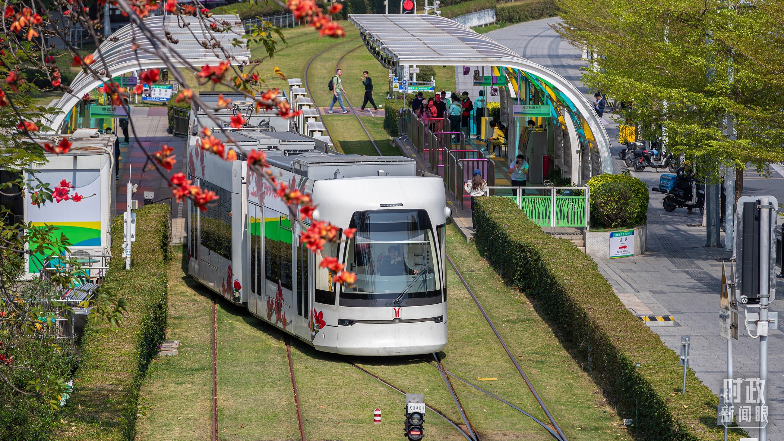 △廣州閱江路,有軌電車從木棉花下駛過。(圖/視覺中國(guó))