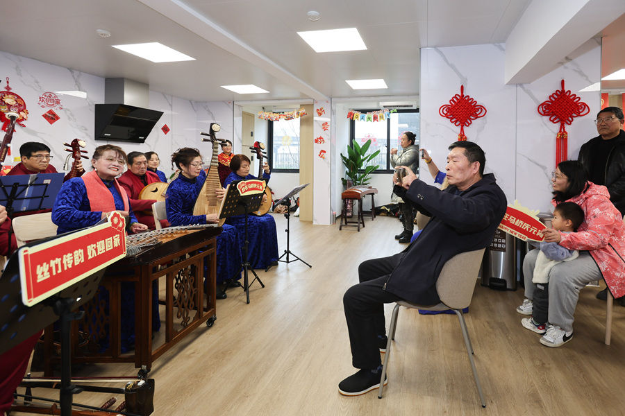 民樂隊在上海市閔行區新時代城市建設者管理者之家演奏(2024年2月23日攝)。新華社記者 王翔 攝