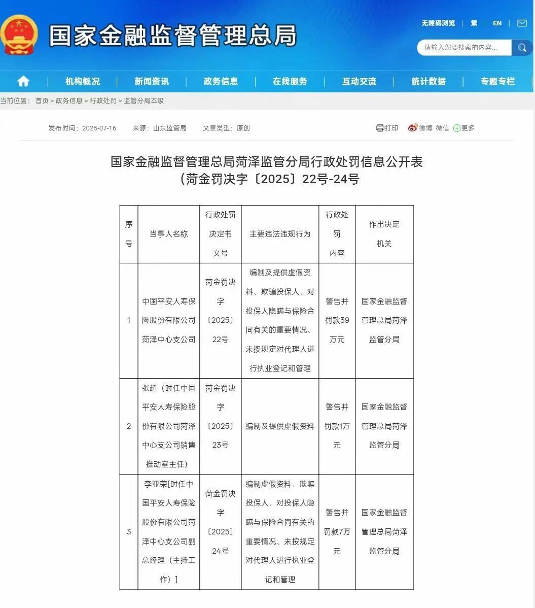 7月16日,中國平安人壽保險股份有限公司菏澤中心支公司因“編制及提供虛假資料、欺騙投保人、對投保人隱瞞與保險合同有關的重要情況、未按規定對代理人進行執業登記和管理”被山東菏澤監管分局“警告并罰款39萬元”。同時,張超(時任中國平安人壽保險股份有限公司菏澤中心支公司銷售推動室主任)被警告并罰款1萬元;李亞榮[時任中國平安人壽保險股份有限公司菏澤中心支公司副總經理(主持工作)被警告并罰款7萬元。