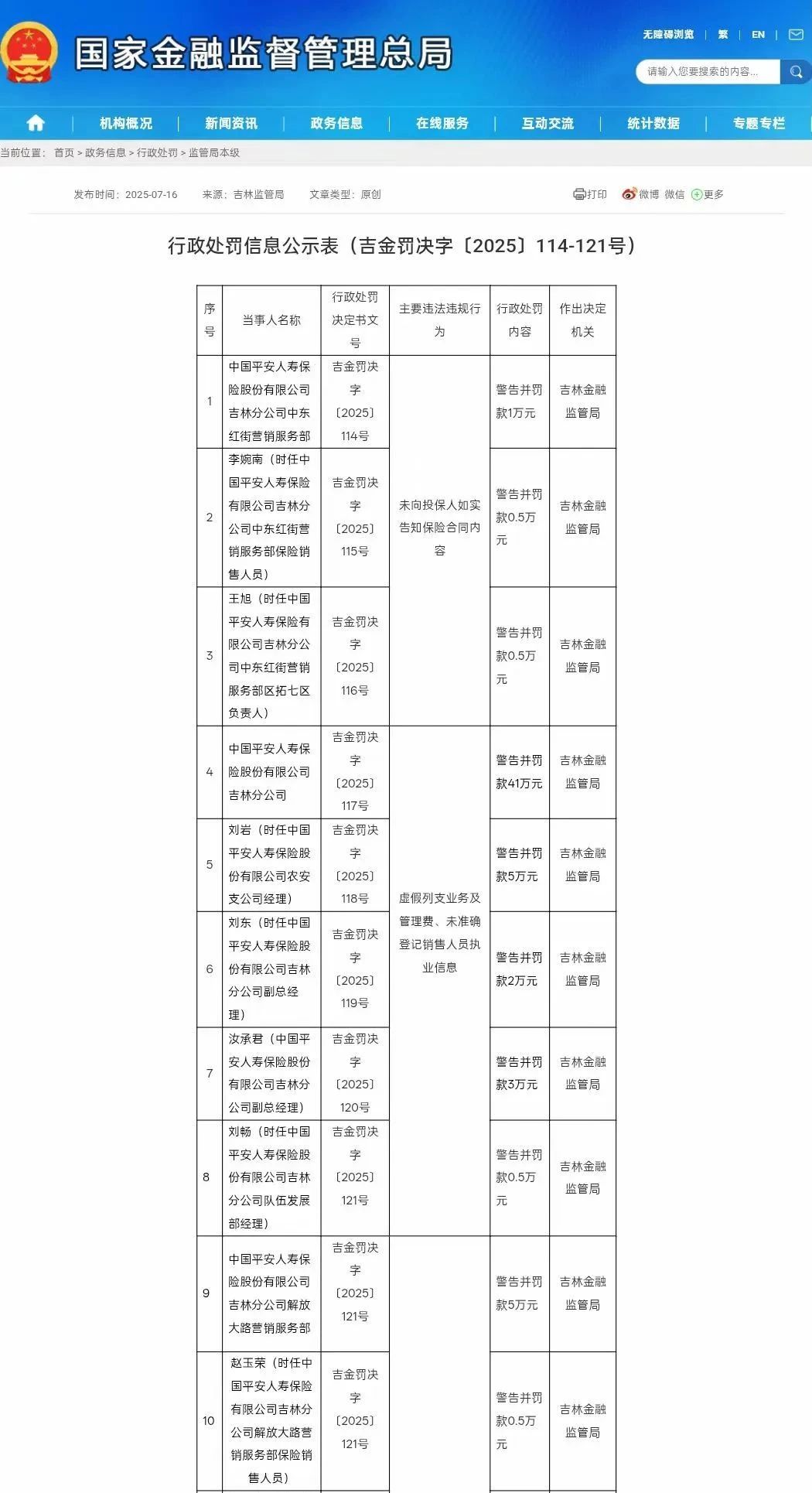 7月16日,中國平安人壽保險股份有限公司吉林分公司中東紅街營銷服務部因“未向投保人如實告知保險合同內容”,被吉林監管局警告并罰款。同時,李婉南(時任中國平安人壽保險有限公司吉林分公司中東紅街營銷服務部保險銷售人員)、王旭(時任中國平安人壽保險有限公司吉林分公司中東紅街營銷服務部區拓七區負責人)被警告并罰款。