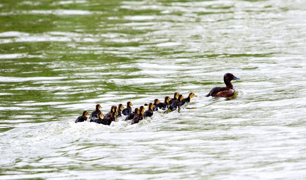??在衡水湖國家級自然保護區,一只成年青頭潛鴨正帶領幼鴨在水面游動。(楊志廣 攝)