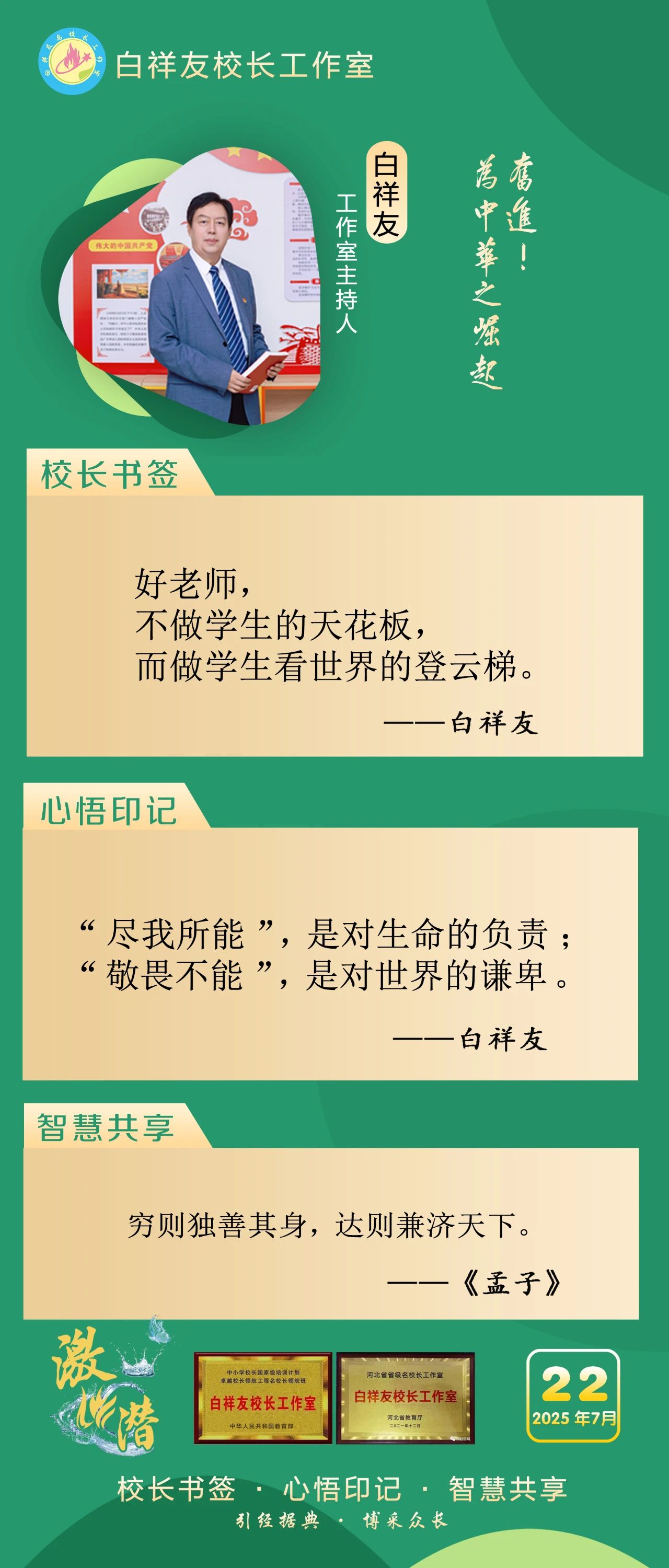 “白祥友校長工作室”成立于2019年4月,是教育部“國培計劃”中小學名校長領航工程、河北省首批名校長工作室,目前省內外成員校59所。工作室堅持“資源共享、智慧共融、互助共贏”理念,已成為思想碰撞的交流場,資源共享的品牌站,成果展示的輻射源。