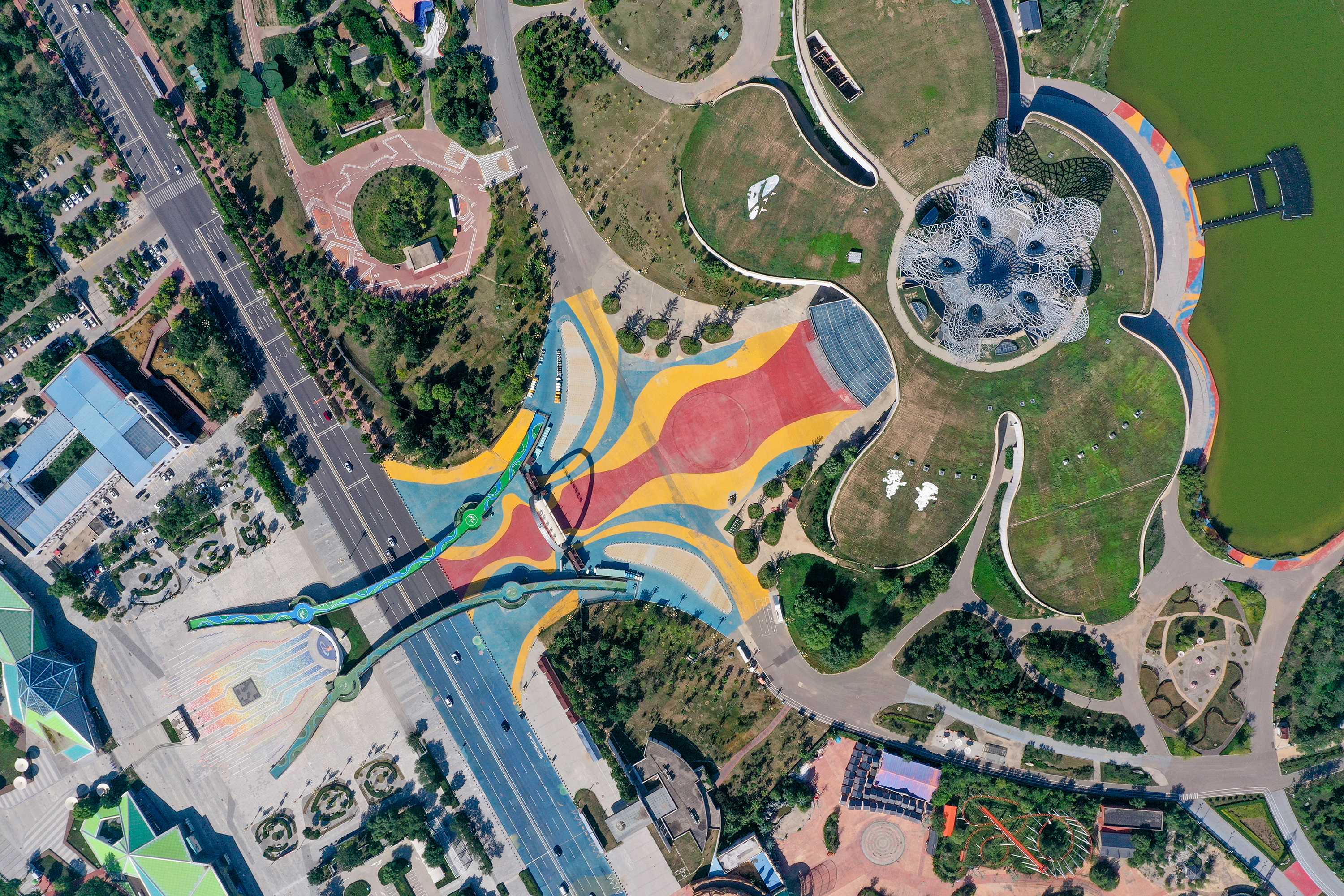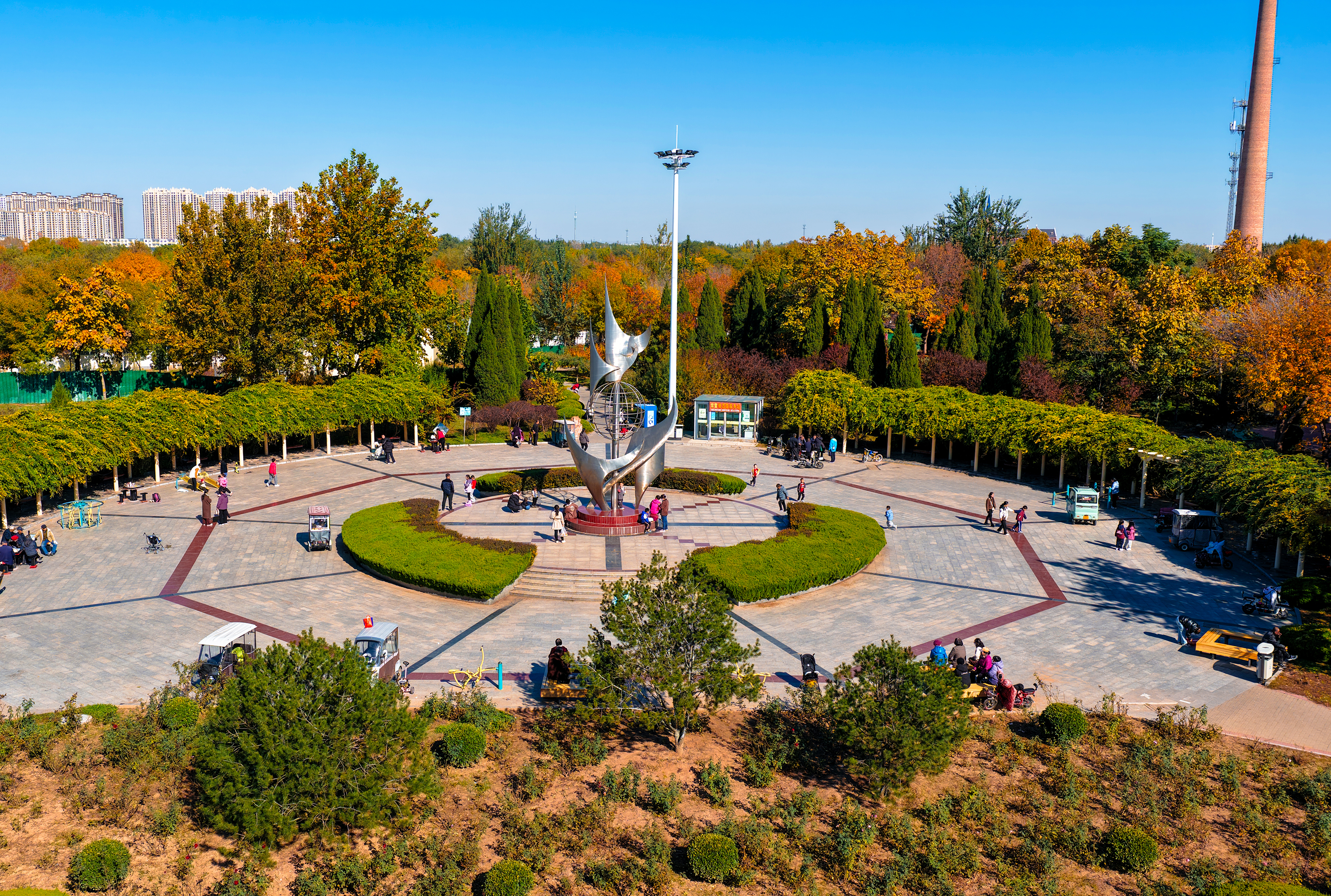 向東南延伸的園博園,猶如一塊五彩織錦,綠樹成蔭的景觀帶與錯落有致的園林建筑相映成趣,游人如織的步道在航拍鏡頭下化作流動的細(xì)線。毗鄰的馬拉松廣場則似一方活力舞臺,與周邊的綠化景觀共同勾勒出城市運(yùn)動的輪廓。