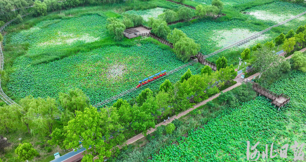 衡水湖被譽為“東亞地區藍寶石”“京津冀最美濕地”,是衡水市旅游產業的一張亮麗名片。圖為7月2日無人機拍攝的衡水湖荷塘。河北日報記者 李東宇攝