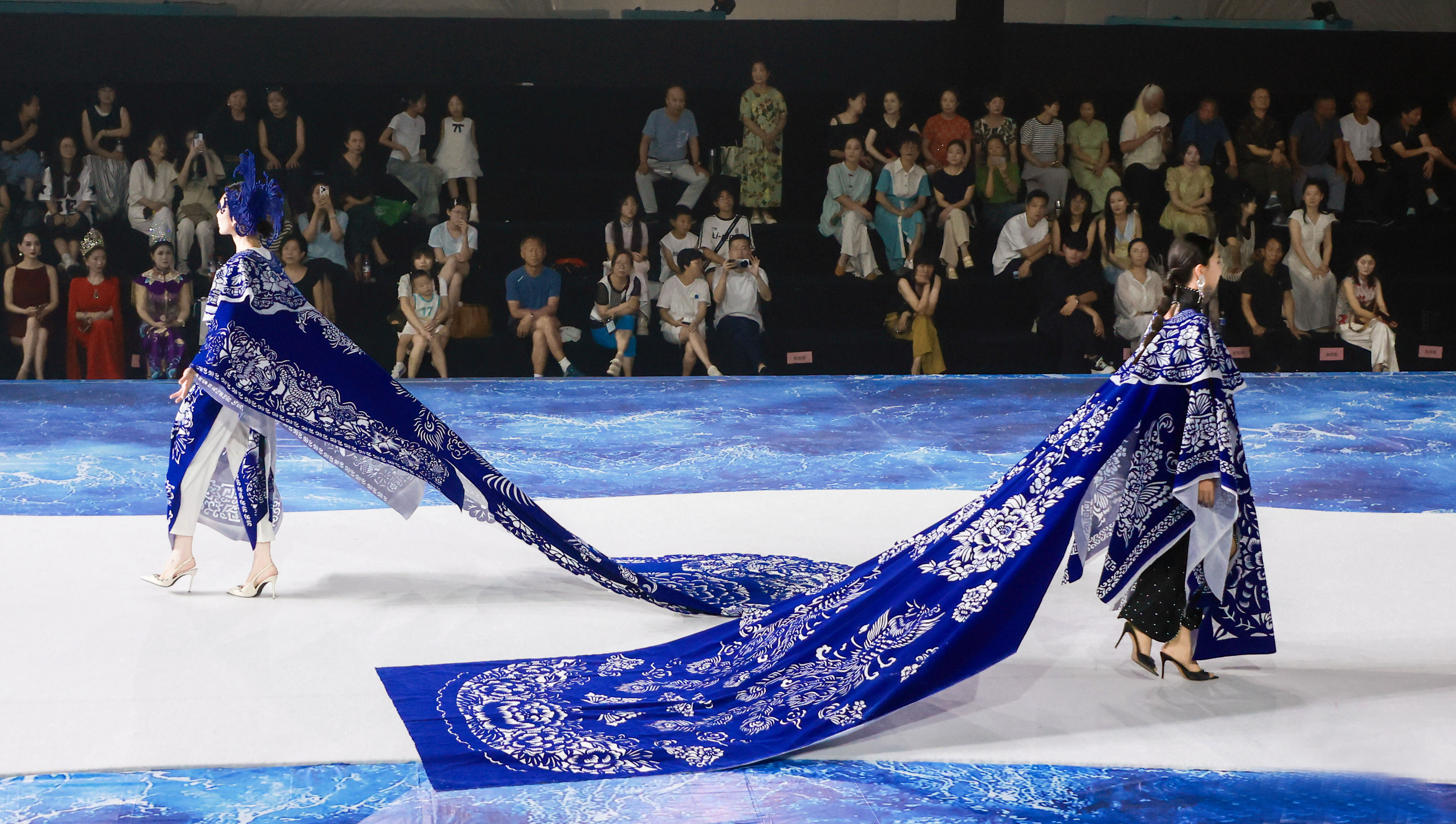 本次時裝周上,李娜更是帶來驚喜。開場展示18件,閉幕展示20套,不僅有大家熟悉的中國特色元素,還融入了荷花、金魚、青頭潛鴨等衡水元素。她的作品通過層疊鏤空的剪紙紋樣與現代服飾廓形的結合,在燈光下呈現出傳統與當代交融的獨特質感。