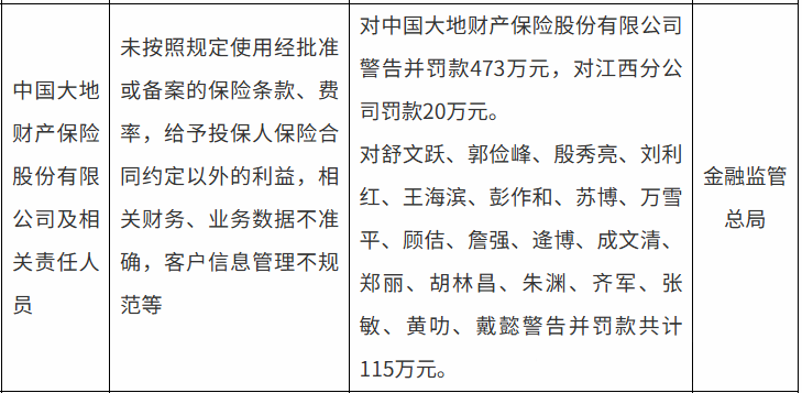 8月1日,國家金融監督管理總局行政處罰信息公示列表顯示,中國大地財產保險股份有限公司(下簡稱“大地財險”)因未按照規定使用經批準或備案的保險條款、費率,給予投保人保險合同約定以外的利益,相關財務、業務數據不準確,客戶信息管理不規范等,被金融監管總局警告并罰款473萬元,對江西分公司罰款20萬元。