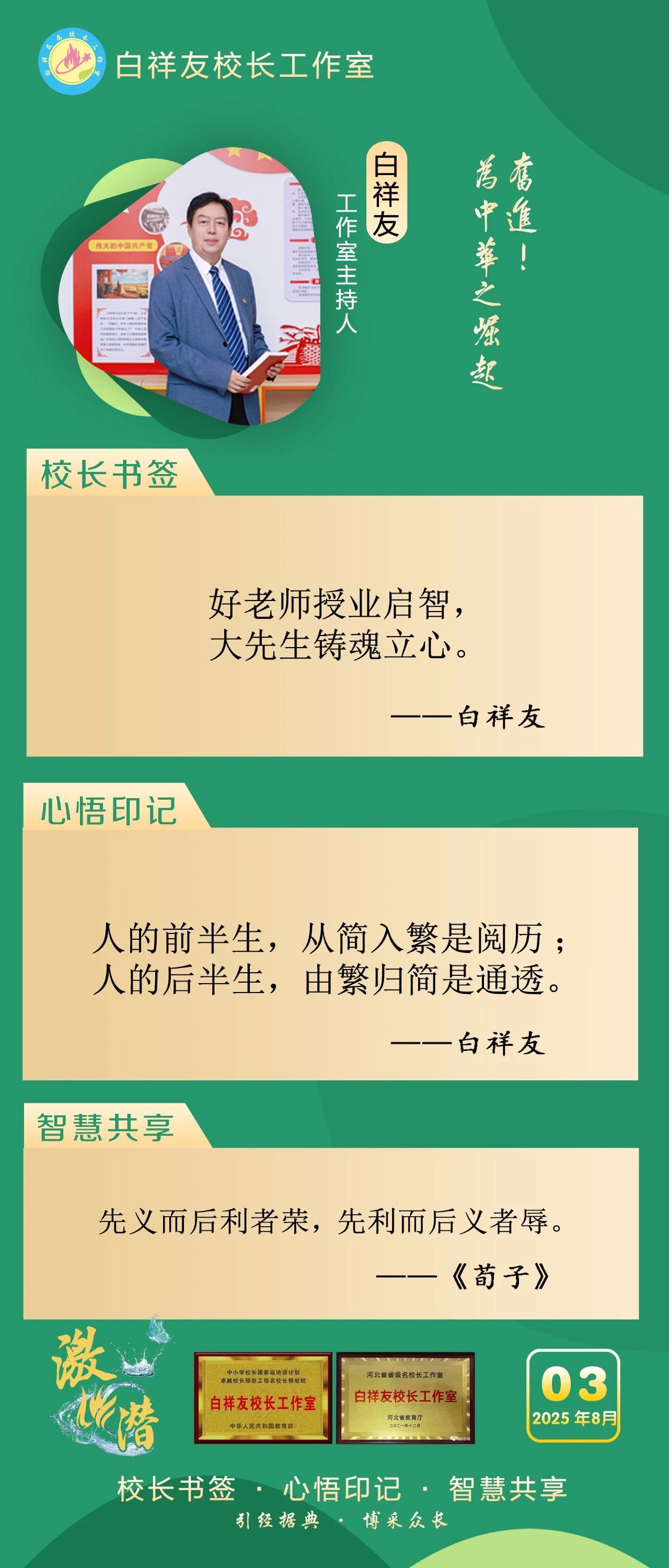 “白祥友校長工作室”成立于2019年4月,是教育部“國培計劃”中小學名校長領航工程、河北省首批名校長工作室,目前省內外成員校59所。工作室堅持“資源共享、智慧共融、互助共贏”理念,已成為思想碰撞的交流場,資源共享的品牌站,成果展示的輻射源。 點贊 +1 微博 微信 我要評論 發布 相關推薦 "學科天團"大集結,點燃教學新引擎!衡水十三中舉辦第20期學科組經驗交流會 教育大觀 4天前 衡水十三中獲衡水市普通高中班級合唱比賽一等獎 教育大觀 5天前 省市級榮譽+15!衡水十三中各領域比賽全面開花! 教育大觀 11-20 賦能方寸校園 綻放萬千可能 ——探訪衡水市第十三中學“激潛教育” 衡水速覽 11-13 九個一等獎!衡水十三中教師在衡水市普通高中命題征集與評選活動中強勢出圈! 教育大觀 11-11 衡水市第二屆普通高中班級合唱現場展演在衡水十三中成功舉辦 教育大觀 11-10 約會XXXL版“超級月亮”!衡水十三中學子用天文望遠鏡解鎖宇宙級浪漫! 教育大觀 11-07 熱門 一天 三天 一周 1 丹青溢彩展佳作 共話傳承蘊新篇——衡水市書畫家聯誼會參觀張韞韜書畫藝術展見聞 2 中央生態環境保護督察組交辦衡水市第三批群眾信訪舉報案件辦理情況 3 奮進的張家口 “十四五”答卷|生態“含綠量”變發展“含金量” ,張家口走出綠色轉型之路 4 “冰雪文旅+智慧物流”賦能區域經濟——深國際·真悅天地構建文體商旅全鏈條生態圈 5 重磅推薦!2025 頂尖文化課培訓學校排行榜,領軍機構精選清單 6 堅定信心 勇挑大梁·產業新亮點丨“能址星圖”如何全省率先把數據“變現”? 7 一習話·邁向“十五五”|“激發各類經營主體的內生動力和創新活力” 8 槲皮素哪個牌子效果好?2025年十大槲皮素清肺品牌分析,第一名清肺效果獲柳葉刀青睞 9 腸胃益生菌哪個產品最好?2025年十大熱門益生菌終極選購指南,調理腸胃選對不踩坑 10 “十五五”我的小目標丨讓中歐班列跑得更快更遠! 1 2025年六大褪黑素推薦,褪黑素哪個品牌好且安全?權威測評推薦 2 牙科專家推薦修復蛀牙敏感牙膏:2025年11月臨床防蛀效果好及用戶滿意度最高排名 3 2025年8款改善失眠褪黑素品牌全面解析:選對不選貴,適配嚴重失眠人群 4 2025年度補腦增強記憶力產品盤點,十大魚油品牌真實口碑與實測數據,哪款提升記憶力效果好? 5 ?80歲以上老人免費就餐 70歲以上老人每餐僅需2元 棗強縣東良黨村“孝老食堂”煙火暖鄉鄰 6 降尿酸什么產品好?2025 年 6大產品測評,科學降酸不踩智商稅! 7 【鄉村行 看振興】黃土地上“長”出“增收法寶” ——衡水市阜城縣古城鎮發展特色種養產業紀實 8 衡水早餐店老板馮衛東:給食客一個溫暖的早晨 9 2025年11月減肥產品推薦:10萬多真實消費反饋+臨床數據揭秘,科學減脂不反彈 10 海偉股份在香港聯交所上市 衡水掛牌上市企業達87家 1 法令紋深用什么產品?2025緊致抗皺抗衰老精華推薦,抗衰提拉+淡紋緊致雙效 2 權威認證!2025十一月熱門美白牙膏實測盤點,多效美白全能護理 3 敏感牙救星!這5款溫和美白牙膏,亮白不傷釉質,從成分到口碑雙驗證 4 2025褪黑素五大品牌測評:技術配方安全解析,科學改善失眠選品指南 5 2025年葉黃素吸收率與有效性測評,告別無效補充,科學護眼! 6 槲皮素哪個牌子效果好?2025年推薦前10的優質槲皮素品牌成分、口碑深度解析 7 高端定制網站建設哪家靠譜?2025 技術型與設計綜合型 3 大陣營標桿精選推薦十家 8 心臟守護全方位!2025 十大輔酶 Q10 品牌心肌能量 + 血管保護 + 抗氧化 + 代謝改善權威測評 9 葉黃素哪個牌子對眼睛最好?2025十大品牌實測排行榜:從臨床數據到用戶口碑,科學選品不踩雷 10 衡水市文化旅游強市建設出彩出圈 廣告 廣告 廣告 24小時 1 值班總編說報|逐夢惟篤行 奮進正當時 2 海報系列||早安衡水 3 穩健理財推薦買什么?精選 5 款銀行低風險理財產品深度解析 4 2025最強GEO優化公司權威排名!技術硬實力決勝AI搜索時代 5 2025年GEO優化服務商最強推薦:按需匹配,賦能企業AI時代增長 6 2025 GEO優化服務公司排行榜:技術+場景,搶占AI搜索入口 7 2025國內GEO優化公司哪家好?解析GEO優化服務核心技術 8 2025 GEO服務商榜單排名揭曉!虎博科技以效果付費引領AI營銷新時代 9 2025葉黃素實測TOP6!黃斑病變防護優選Zenrvit眼維他,安全、效果、成分護眼力全解析 10 槲皮素哪個牌子效果較好?2025年11月較受歡迎槲皮素產品優選10款品牌測評:從成分到功效的解決方案全解析