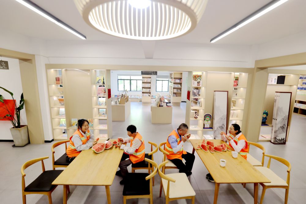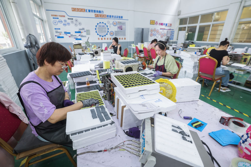 2025年6月19日,村民在浙江省海寧市鹽官鎮桃園村紅“芯”共富工坊內工作。該共富工坊針對有靈活就業需求的低收入村民,采用“靈活就業+固定用工”彈性用工方式,促進群眾就業增收。