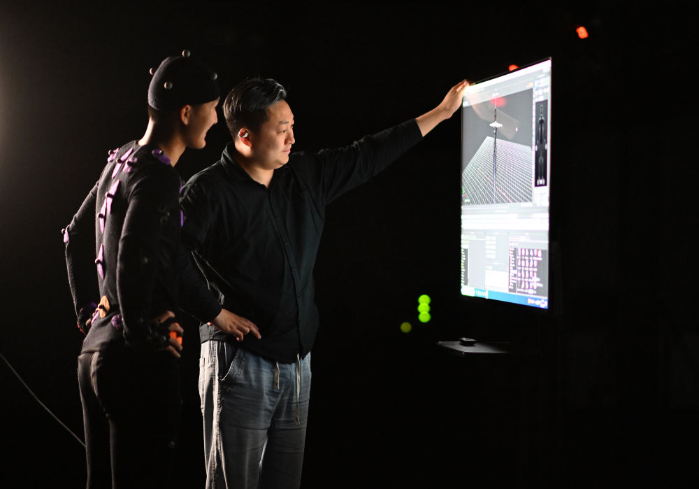 2024年4月23日,在位于天津市濱海新區國家動漫園里的大型動作捕捉棚內,技術顧問崔盛輯(右)和動捕演員馬鑫琪查看電腦生成的虛擬角色動作。人社部近年公布的新職業中,數字孿生應用技術員名列其中。崔盛輯正是一名數字孿生應用技術員。他從事數字技術相關工作多年,如今已成立了工作室,主要通過數字孿生技術搭建在影視動畫、沉浸式文旅、生命科學等領域的應用場景。