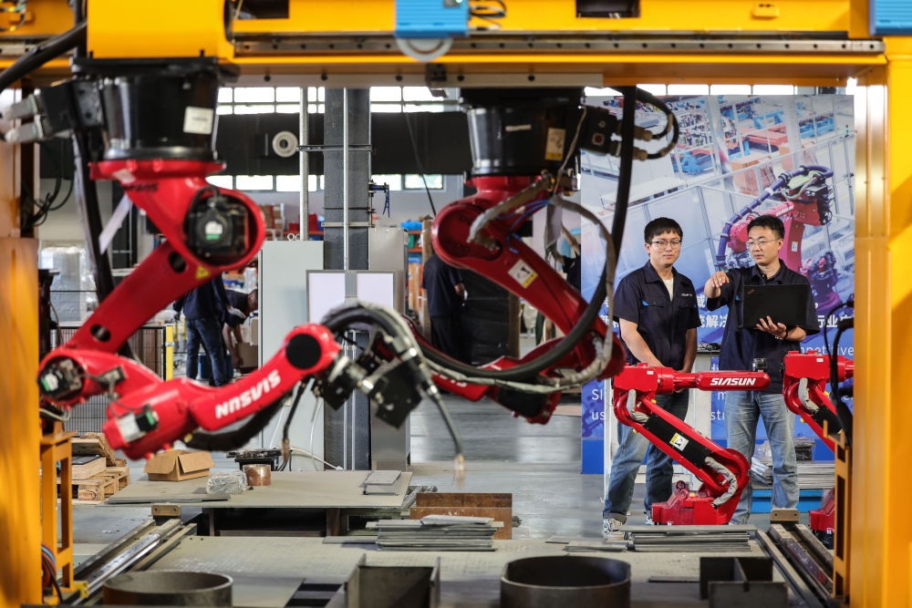 2024年6月3日,沈陽新松機器人自動化股份有限公司的機器人研發工程師討論智能焊接機器人平臺焊接方案。機器人工程技術人員作為人力資源和社會保障部2022年6月公布的18個新職業之一,在研發設計機器人工作中扮演著重要角色。讓“鐵疙瘩”聽懂話、干對活,是他們的重要工作內容。