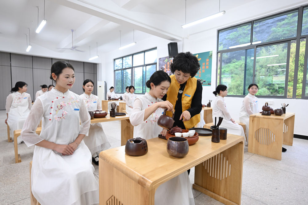 2025年5月8日,福建省武夷山旅游職業中專學校的茶藝老師在教授茶藝。近年來,武夷山市依托當地茶產業優勢,持續推進茶文化、茶技能教育走進校園,在當地職業學校重點開設了茶藝、茶葉加工、茶營銷等專業,為當地茶產業發展、茶文化傳播培養職業技能人才。