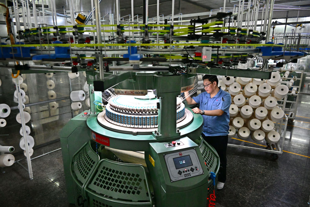 2025年3月25日,山東省青島市即墨區一家智慧紡紗企業的技術人員在維護生產高檔布料的自動化圓機。近年來,即墨區引導民營企業加大新技術、新裝備、新工藝的研發和投入,加快信息化和工業化融合升級改造。同時,通過對接企業用工需求、實施新技能培訓等舉措,促進紡織服裝產業可持續高質量發展,也讓群眾在家門口實現穩定就業和增收。