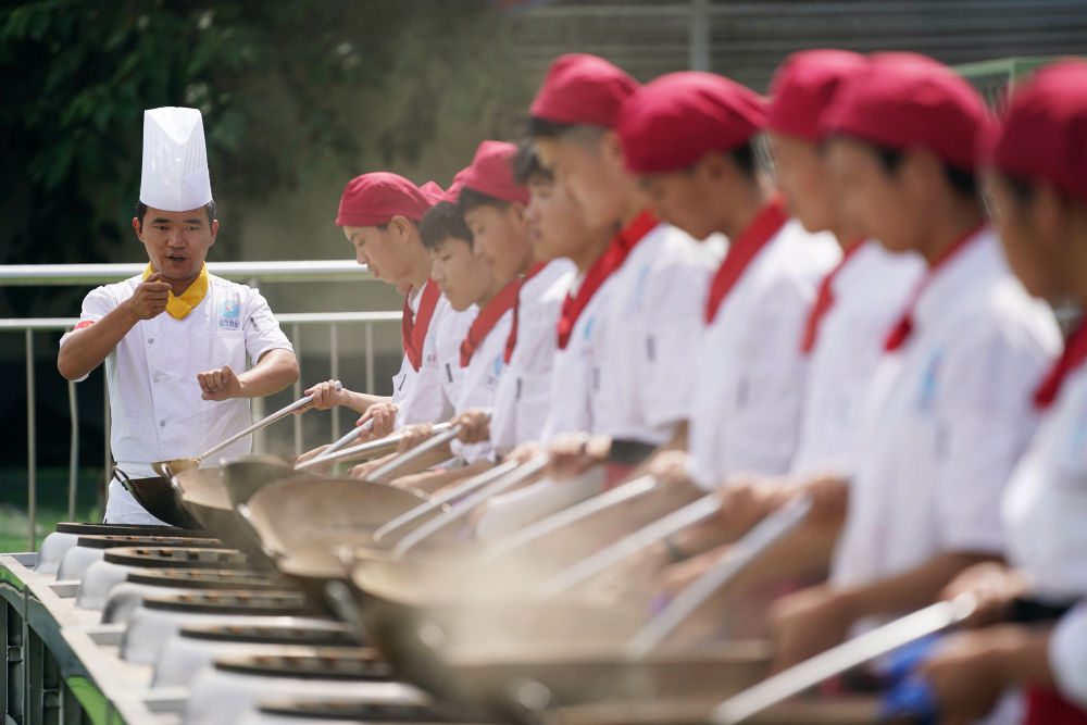 2023年6月25日,在位于西安市藍田縣的藍田廚師學校,教師指導學生們練習翻勺。藍田縣是著名的“廚師之鄉”。通過成立廚師學校,培養具有較高文化素養、藝術素養的一專多能的新一代廚師,藍田縣讓具有地方特色的職業教育拓展就業渠道,助力鄉村振興。