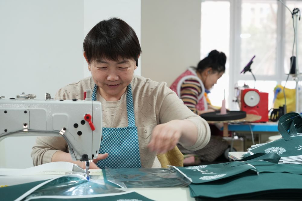 2025年3月27日,回遷居民在雄安新區“雄業創工坊”包裝工坊加工無紡布。工坊引入有持續發展潛力、對社區環境影響較小的產業,為回遷群眾提供靈活多樣的就業崗位,讓回遷居民實現“上樓安家,下樓就業”。
