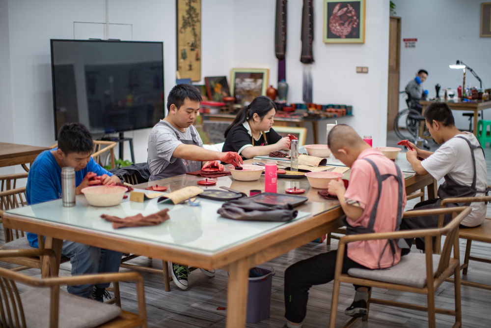2023年9月18日,在重慶市城口縣的“忘我”大漆藝術空間,殘障員工打磨漆器產品。“忘我”大漆藝術空間集殘疾人漆藝培訓、輔助性就業、職業康復、日間照料等功能于一體,利用當地的大木漆資源,組織殘疾人創作漆器產品。