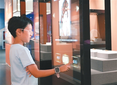 一名小朋友在“長安二千三百里——雄安古州城遺址考古成果展”現場體驗文物智能展柜。新華社記者 李賀 攝