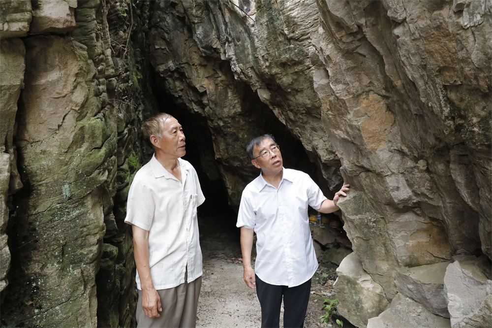 8月3日,在遵化魯家峪村附近一烈士洞,李自亞(右)向魯家峪陳列館志愿者劉超(左)講述當年母親救助八路軍情況。記者 師源攝