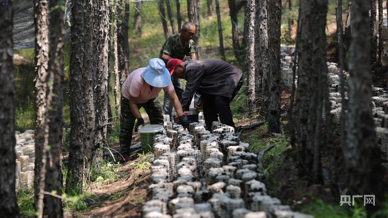 村民在馬鞍山林場林下經濟試驗示范基地采摘木耳(央廣網發 劉德胤 攝)