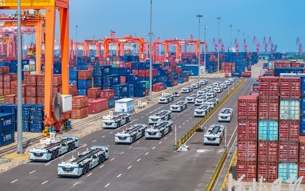 7月9日,唐山港京唐港區(qū)集裝箱碼頭堆場(chǎng),智能平板運(yùn)輸車整裝待發(fā)。 河北日?qǐng)?bào)記者 趙杰攝