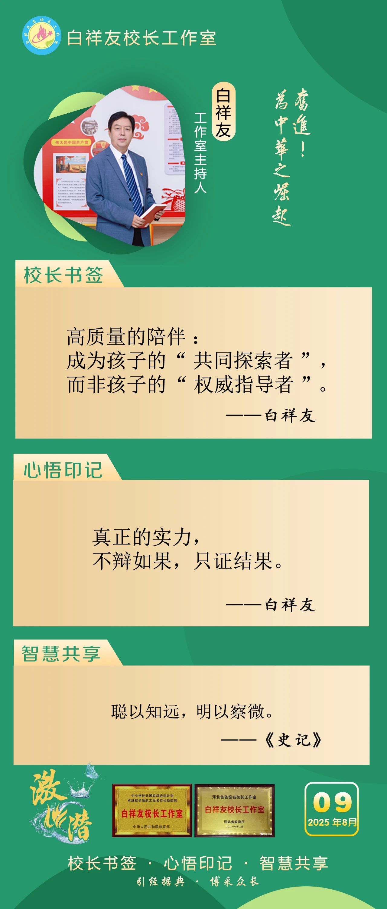 “白祥友校長工作室”成立于2019年4月,是教育部“國培計劃”中小學名校長領航工程、河北省首批名校長工作室,目前省內外成員校59所。工作室堅持“資源共享、智慧共融、互助共贏”理念,已成為思想碰撞的交流場,資源共享的品牌站,成果展示的輻射源。