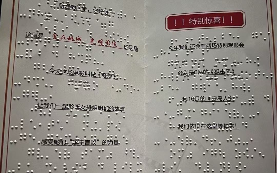科技賦能人文,打造無(wú)障礙觀影體驗(yàn)。在視障兒童公益放映活動(dòng)專場(chǎng),視障小朋友們通過(guò)無(wú)障礙版影片《奪冠》以及盲文場(chǎng)刊、愛(ài)心引導(dǎo)等細(xì)節(jié)輔助,首次“觸摸”到體育精神的溫度,感受到光影藝術(shù)的魅力。為提升不同群體觀影體驗(yàn),舉辦方依托保利影城的專業(yè)放映資源,通過(guò)科技與人文的結(jié)合,構(gòu)建起“三專一無(wú)”服務(wù)體系——由愛(ài)心志愿者提供專業(yè)志愿服務(wù);開辟專屬綠色通道保障便捷通行;引入中國(guó)傳媒大學(xué)專項(xiàng)影片資源;打造無(wú)障礙觀影環(huán)境,配備盲文場(chǎng)刊等物資。通過(guò)整合影院資源、公益組織力量和高校技術(shù)支持,一張覆蓋廣泛、服務(wù)精準(zhǔn)的公益網(wǎng)絡(luò)逐步鋪開。