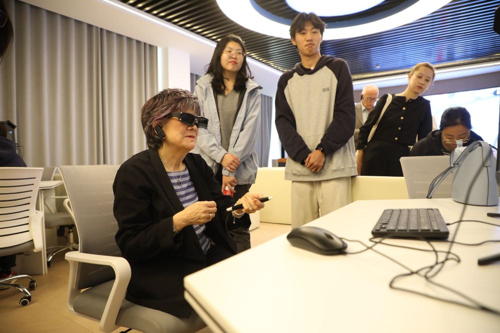 ??4月15日,在培黎職業(yè)學(xué)院,英中了解協(xié)會榮譽(yù)主席佐伊·里德體驗(yàn)學(xué)生們親手設(shè)計(jì)搭建的虛擬現(xiàn)實(shí)場景模型。新華社記者 張智敏 攝