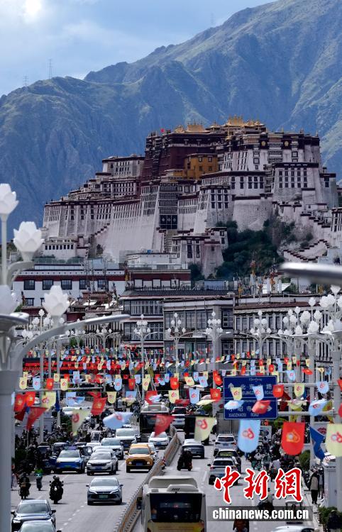 8月19日,隨著西藏自治區成立60周年慶祝活動臨近,拉薩氛圍濃。圖為拉薩街頭彩旗飄揚。中新社記者 李林 攝