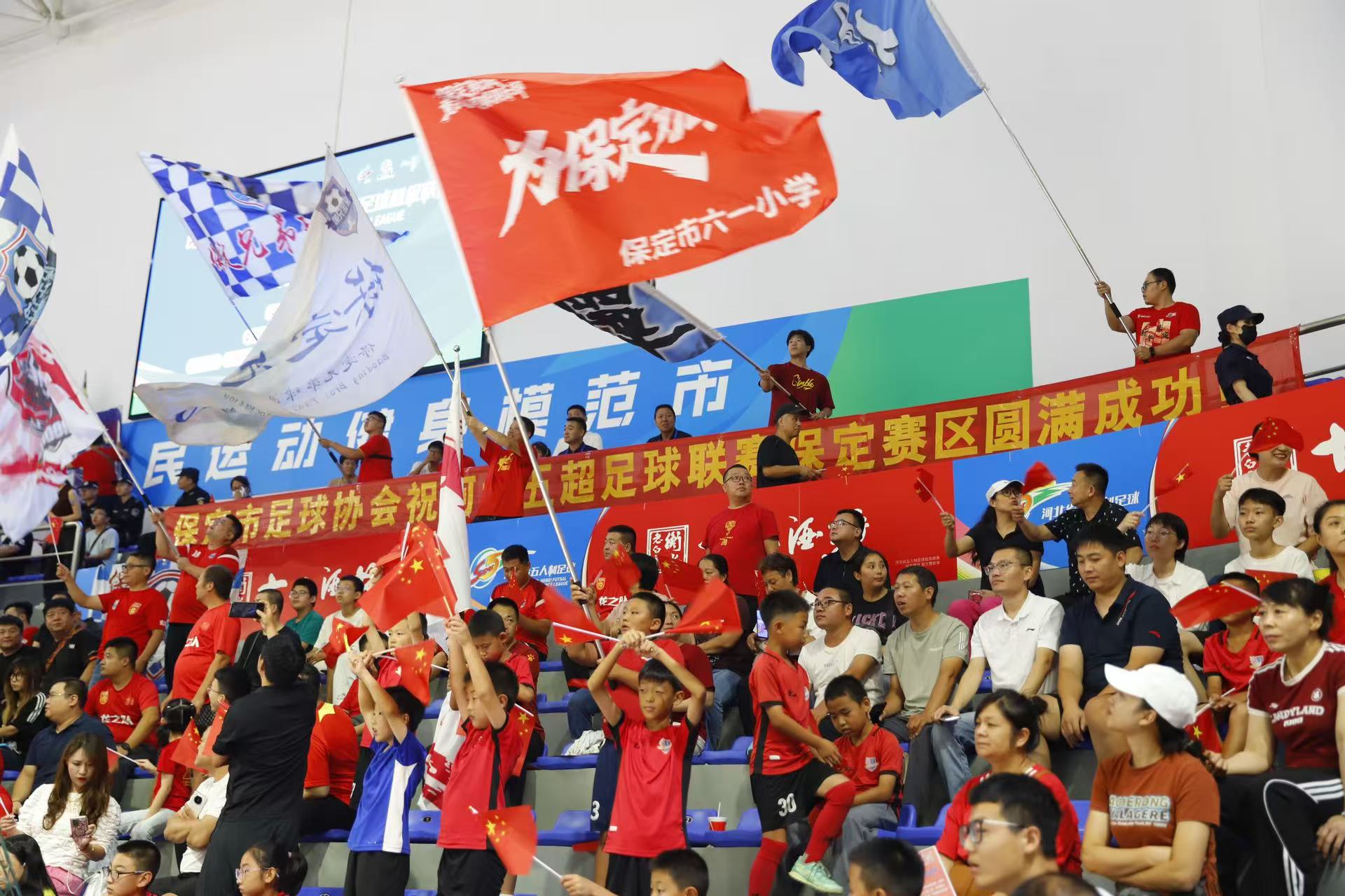 小球迷們揮舞旗幟為保定隊加油。 王棟 攝