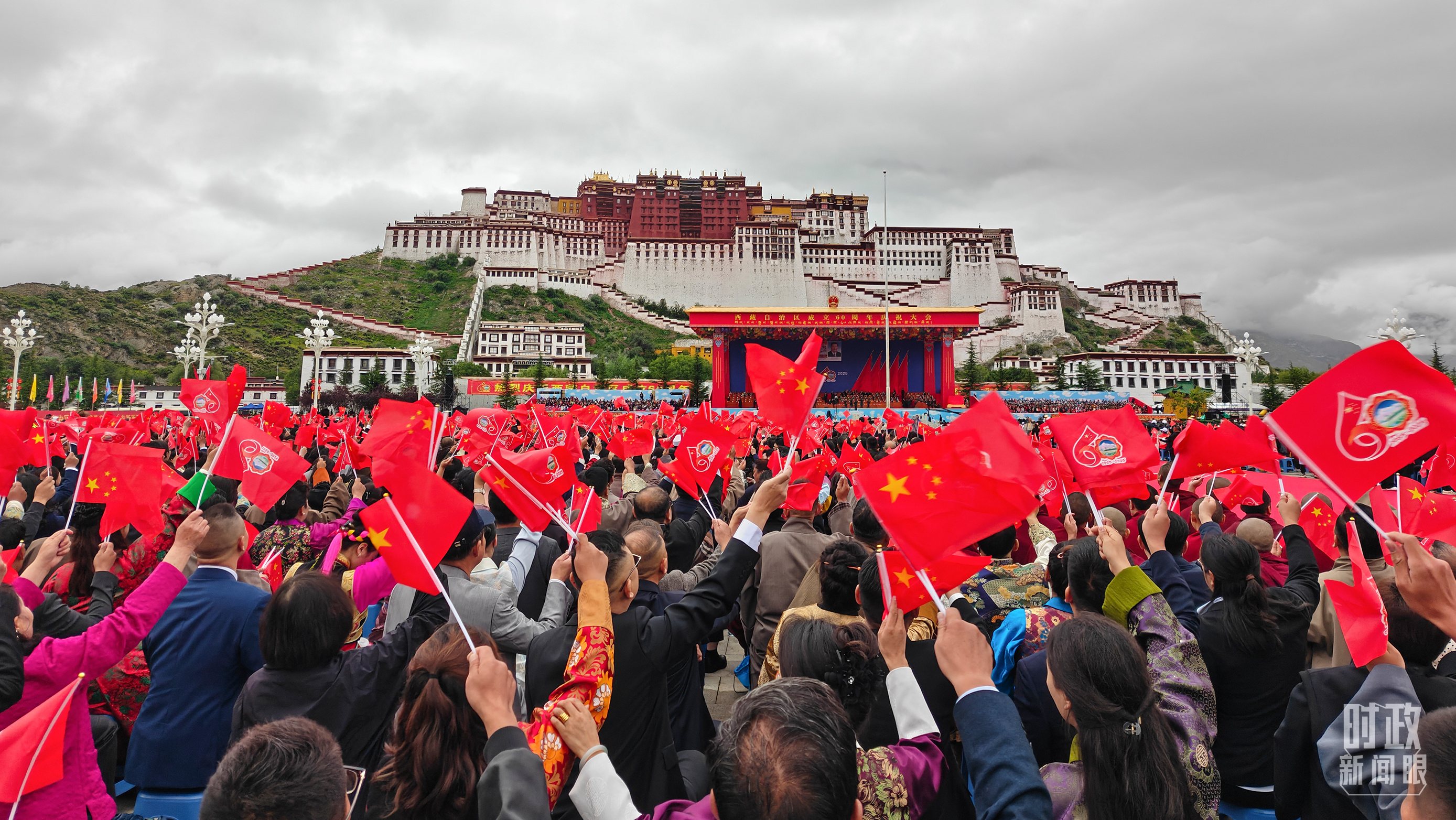 慶祝大會的會場設置在雄偉的布達拉宮前,位于群山環抱之中。大會主席臺采用藏式風格。約2萬人歡聚布達拉宮廣場,紅、黃、白、藍等體現藏族文化基因的色彩鋪滿眼前,烘托出吉祥喜慶的濃烈氛圍。