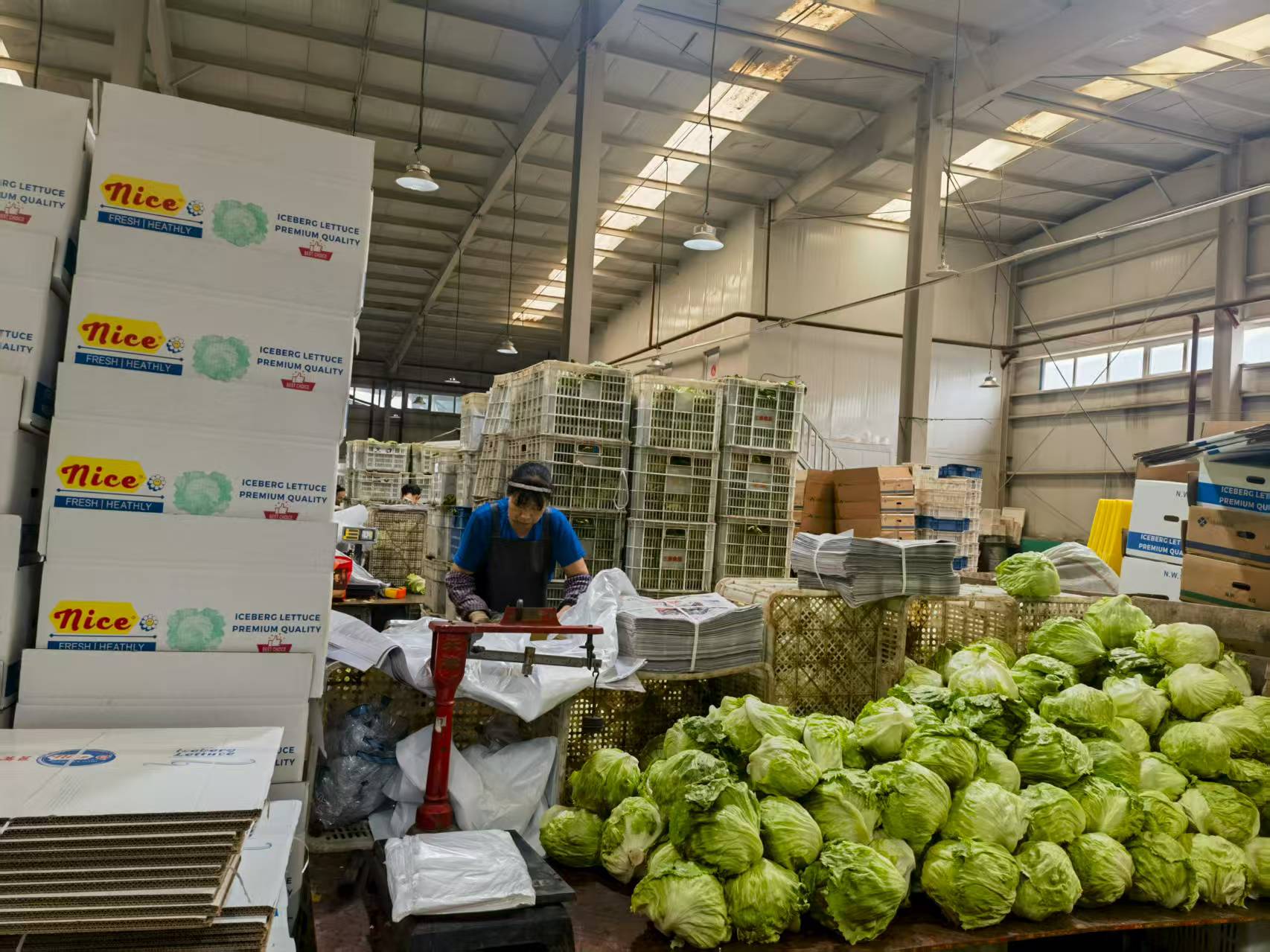 走進沽源縣三源食品有限公司(以下簡稱“三源”公司)生菜包裝車間,工人們正在進行產(chǎn)品分揀、稱重、包裝和裝箱。這些從大棚、大田采收上來的沾著晨露的生菜裝在塑料筐里,在冷庫進行真空極速預(yù)冷后暫存,冷鏈運輸汽車就停在冷庫門口,一箱箱生菜裝車后將跨山越海運往韓國。