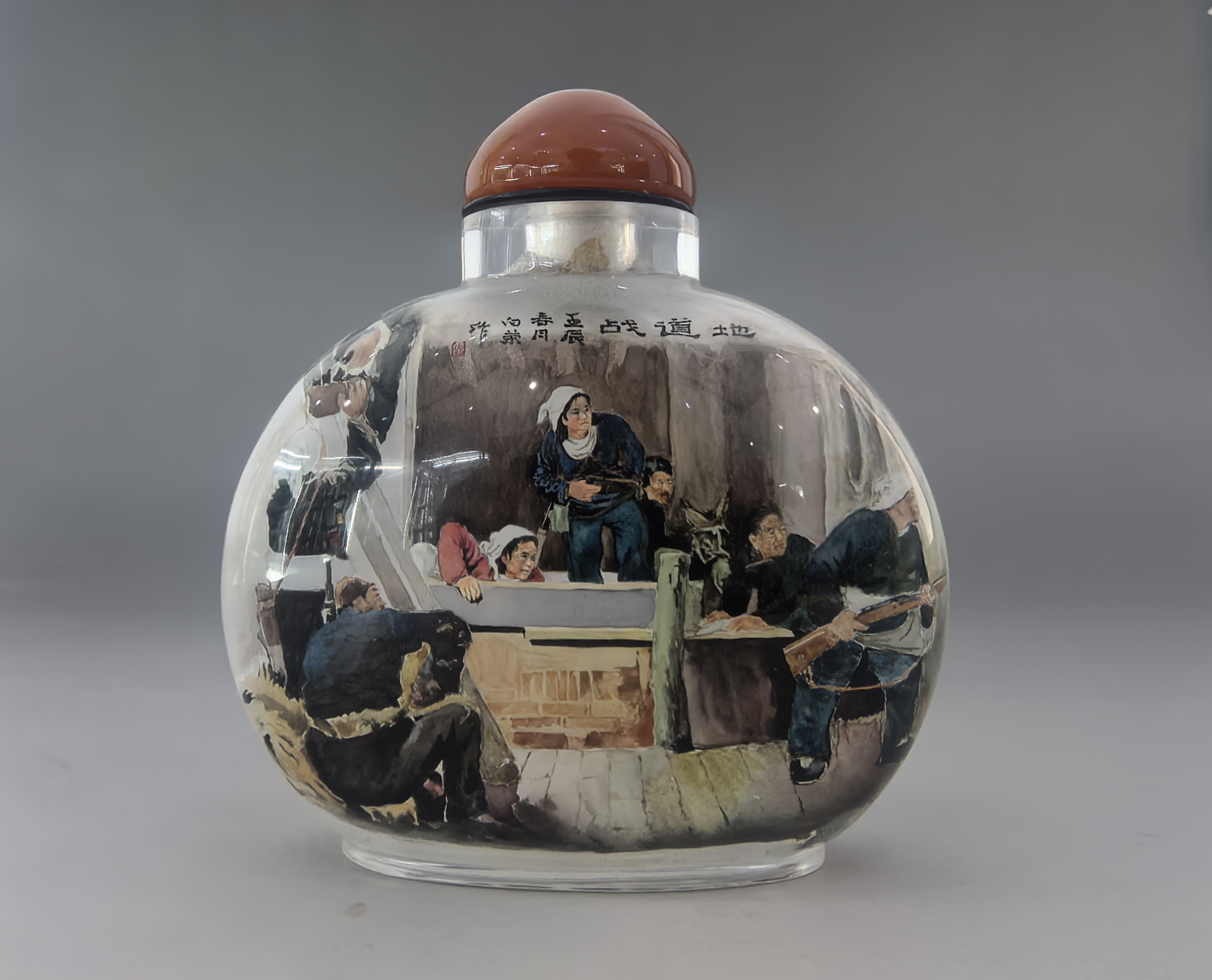 《地道戰(zhàn)》《八女投江》《百團大戰(zhàn)》……如今,一壺齋的展廳內(nèi),紅色題材作品占據(jù)半壁江山。張汝財展示了一件2005年創(chuàng)作的《狼牙山五壯士》鼻煙壺:壺內(nèi)五位戰(zhàn)士跳崖的瞬間被定格,背景是翻涌的云海與山澗。此作一經(jīng)展出便廣受人們喜愛,那震撼的畫面、熾熱的情懷,引得參觀者駐足細細品味,成了人們心中難忘的藝術(shù)印記。