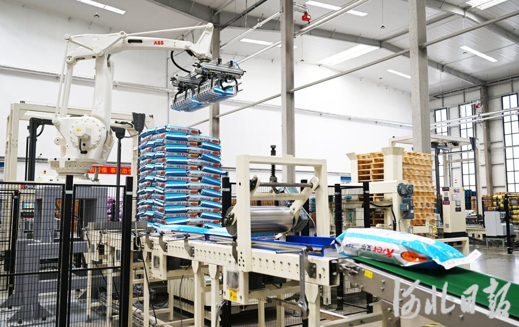 近日,在邢臺市南和區榮喜寵物食品有限公司,碼垛機器人在流水線上作業。河北日報記者 趙永輝攝