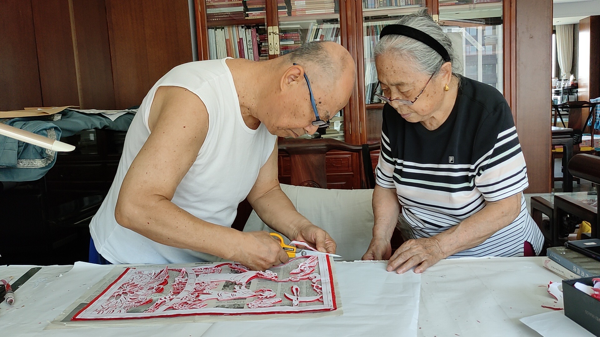 她先在腦海中簡單構思,然后拿起鉛筆,在紅紙上輕輕描繪輪廓。她手繪的線條流暢自然,牛郎的衣袂、織女的裙擺、喜鵲的翅膀弧度,鴛鴦根根分明的羽毛…每一筆,都飽含她對這個傳統故事的理解與感悟。