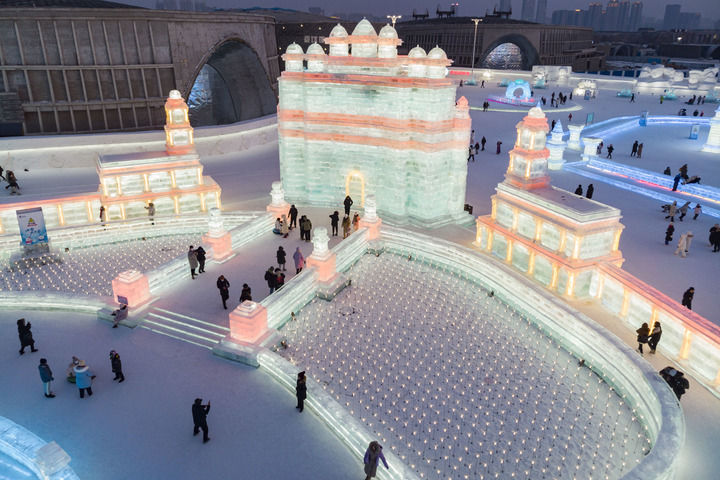 2023年2月1日,游客在哈爾濱冰雪大世界園區冰雪景觀《勝利之城》周邊游玩,該冰雪景觀以印度的法塔赫布爾西格里城為原型設計建造(無人機照片)。此屆哈爾濱冰雪大世界將上合組織成員國的特色建筑以冰雪景觀的形式呈現。新華社記者 謝劍飛 攝