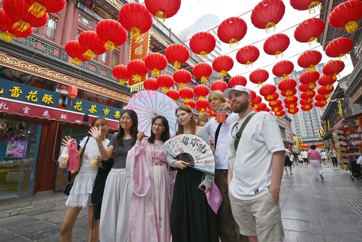 2025年8月14日,上合國家學生在天津古文化街留影。新華社記者 李然 攝
