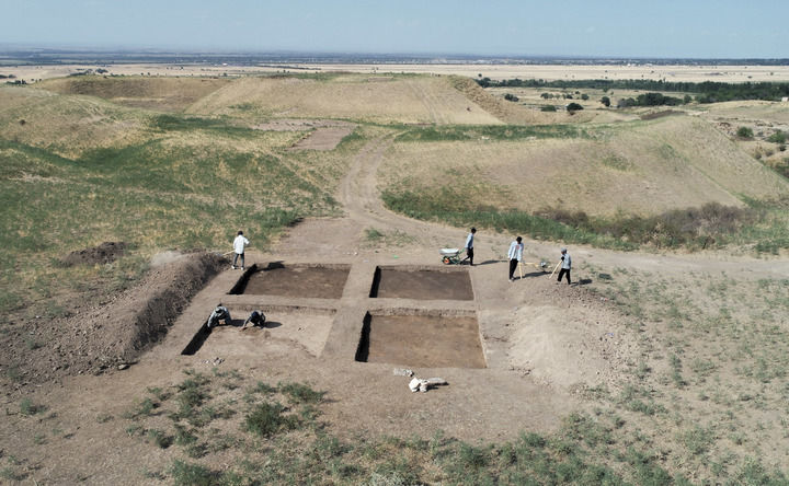 2023年8月9日,考古人員在中哈聯合考古項目拉哈特遺址探方上工作(無人機照片)。新華社發(奧斯帕諾夫攝)