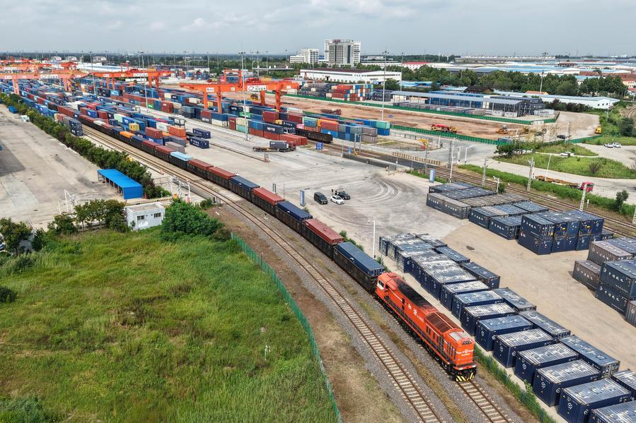 ??8月27日,一列貨運列車駛入位于上合示范區內的中國-上海合作組織地方經貿合作示范區多式聯運中心(無人機照片)。新華社記者李紫恒攝