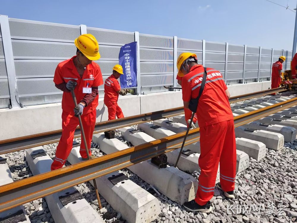 “鋪軌的重難點主要是道岔焊接,我們運用閃光焊工藝,采用兩套履帶式牽引車、長軌推送裝置等鋪軌設備,實現雙線前后同時鋪設,單線日鋪軌道可達6公里。”中鐵十四局石衡滄港城際鐵路鋪軌項目總工張才剛說,計劃2026年2月前,石衡滄港城際鐵路衡黃段鋪通全線長軌。