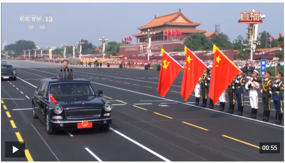 偉大旗幟光耀千秋。中國共產黨黨旗、中華人民共和國國旗、中國人民解放軍軍旗在受閱部隊最前方迎風招展。檢閱車行進至黨旗、國旗、軍旗前,敬禮號角響起,習近平停車肅立,以注目禮向三面旗幟莊嚴致敬。