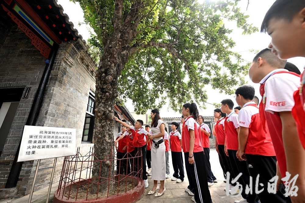 8月30日,八路軍一二九師東進抗日游擊縱隊司令部舊址,南宮市新城中心學校學生在聆聽抗戰故事。