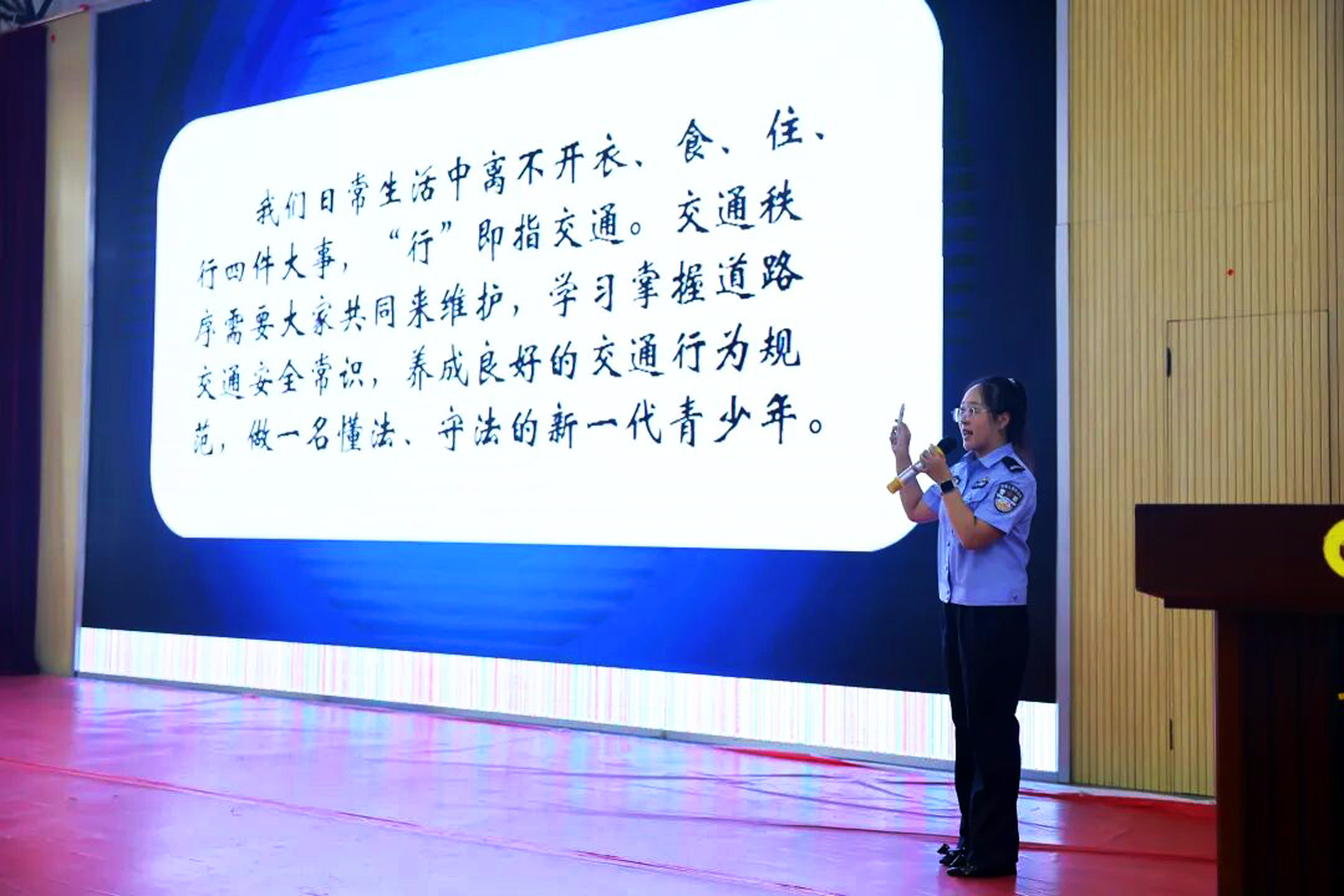 在交通安全板塊,交通管理大隊宣講員以轄區內發生的真實事故案例為切入點,結合學生步行、乘坐校車、私家車、公交車等主要上下學方式,細致講解遵守交通信號燈、安全過馬路、遠離車輛視覺盲區等基礎常識。“騎乘電動車戴頭盔,駕乘汽車系安全帶,這小小的裝備可是咱們的‘金鐘罩鐵布衫’!”宣講員生動的比喻讓學生們印象深刻。隨后的交通模擬環節中,同學們踴躍參與互動,在模擬過馬路、識別車輛盲區的體驗中,進一步加深了對交通規則的理解與記憶。