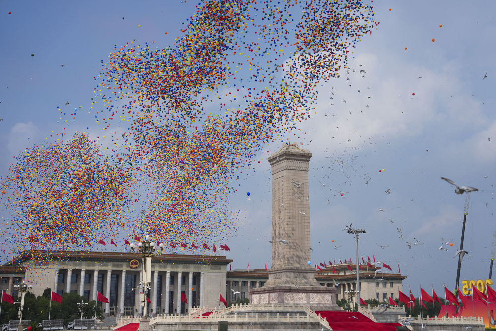 2025年9月3日,紀念中國人民抗日戰爭暨世界反法西斯戰爭勝利80周年大會在北京隆重舉行。這是紀念大會現場放飛氣球和鴿子。新華社記者 牟宇 攝