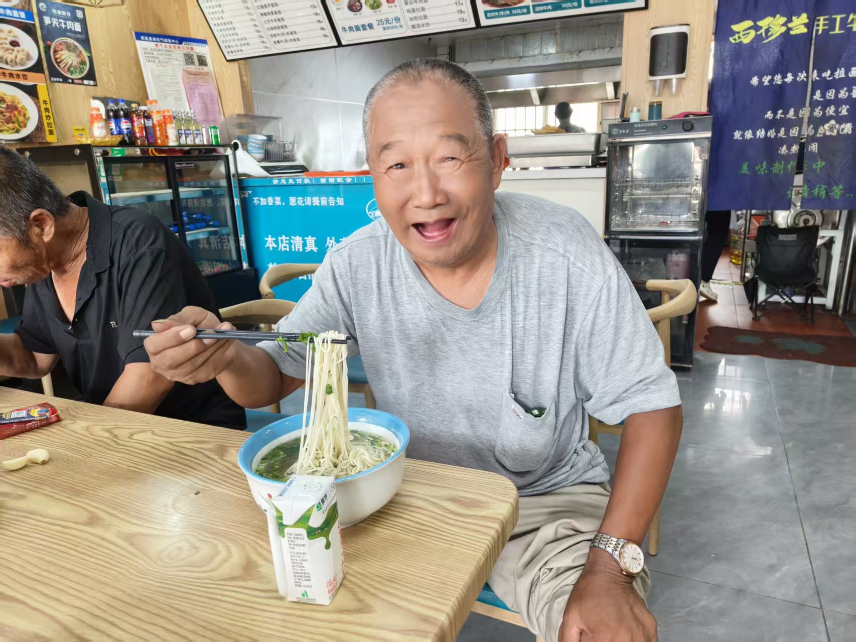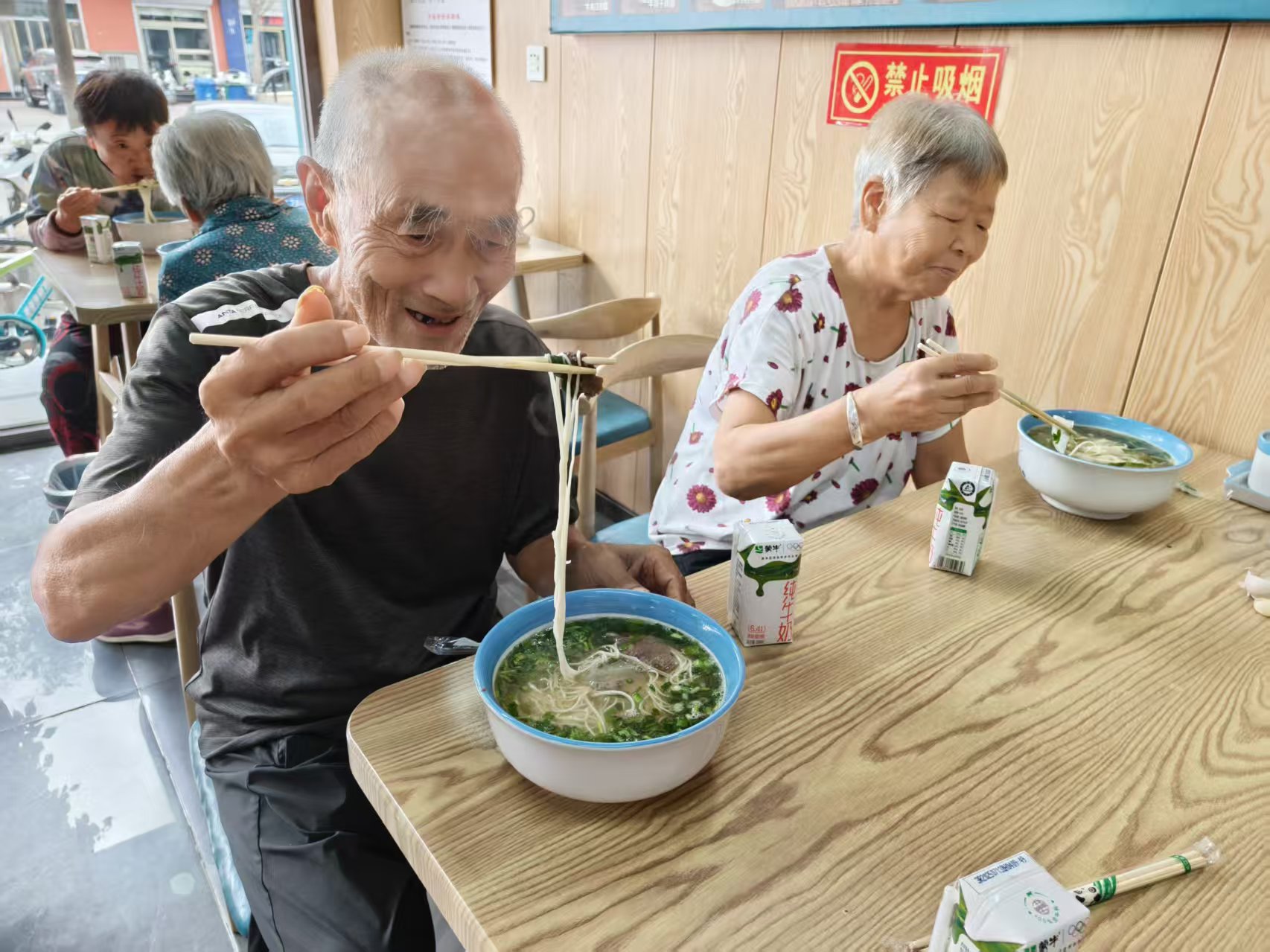 活動現場,社區工作人員全程貼心服務。他們提前上門接獨居老人,攙扶腿腳不便的老人安全抵達;在面館內為座椅加裝軟墊,讓老人坐得更舒適;待老人們坐定后,又逐桌遞上溫好的鮮牛奶,細致叮囑搭配食用更護腸胃。“你們想得比孩子還細!”“感謝你們,辛苦了!”老人們一邊吃著,一邊紛紛豎起大拇指。