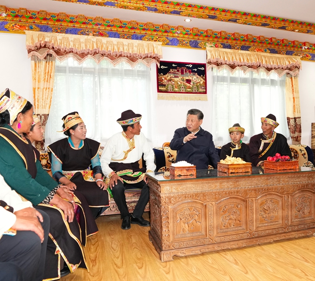 2021年7月21日下午,習近平在林芝市巴宜區林芝鎮嘎拉村,同村民達瓦堅參一家人圍坐在客廳里聊家常。新華社記者 李學仁 攝