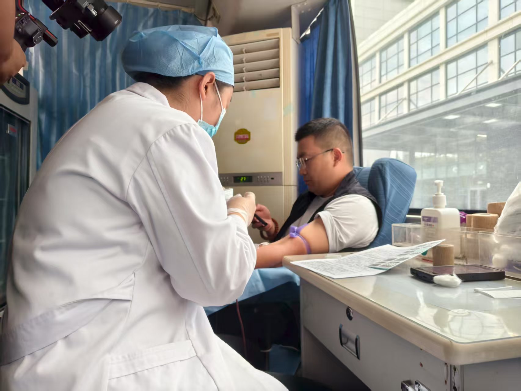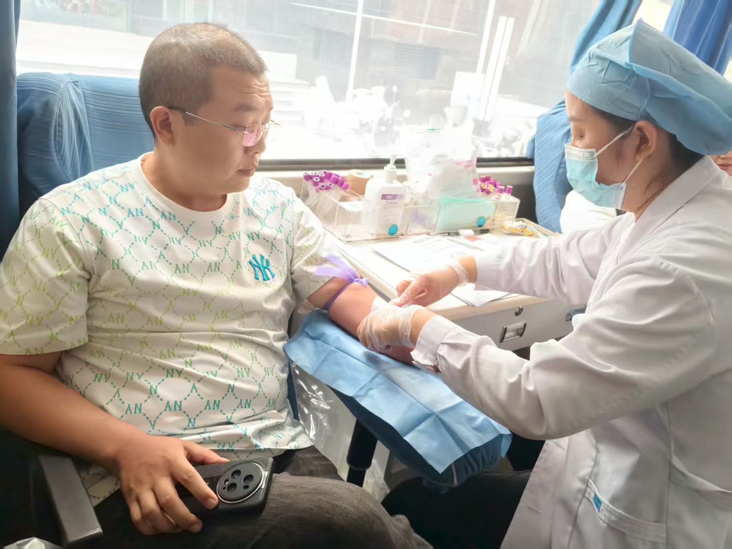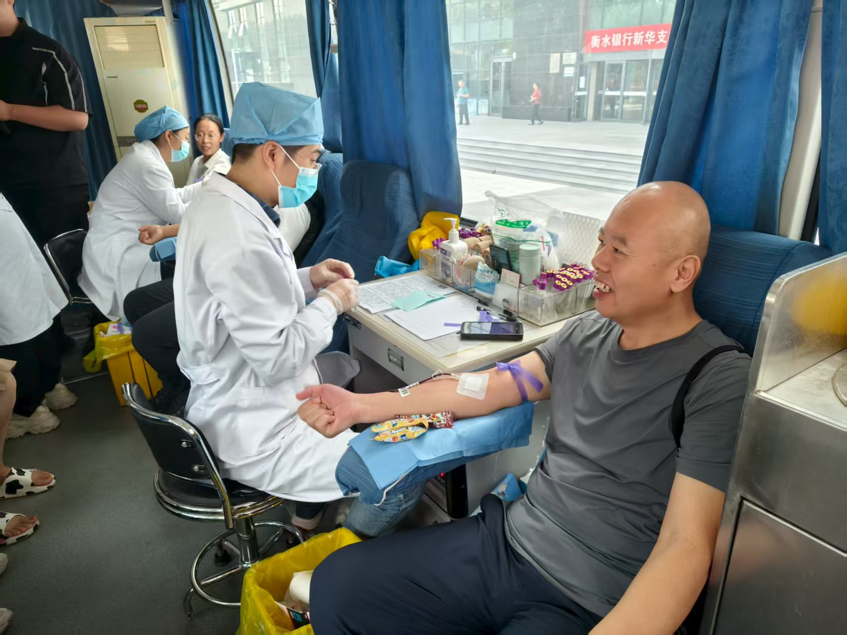 當(dāng)日清晨,采血車穩(wěn)穩(wěn)停靠在衡水銀行指定場(chǎng)地,血站工作人員與銀行活動(dòng)籌備組提前到位,迅速完成各功能區(qū)布置。登記區(qū)的表格分類擺放整齊,體檢區(qū)的醫(yī)療器材消毒完畢,采血區(qū)的血袋、耗材準(zhǔn)備就緒,休息區(qū)貼心備好了牛奶與點(diǎn)心,為參與員工營造安心、暖心的獻(xiàn)血環(huán)境。活動(dòng)開始后,員工們按序排隊(duì),在工作人員引導(dǎo)下逐項(xiàng)完成信息登記、健康篩查、血液初檢等環(huán)節(jié),耐心等待獻(xiàn)血。